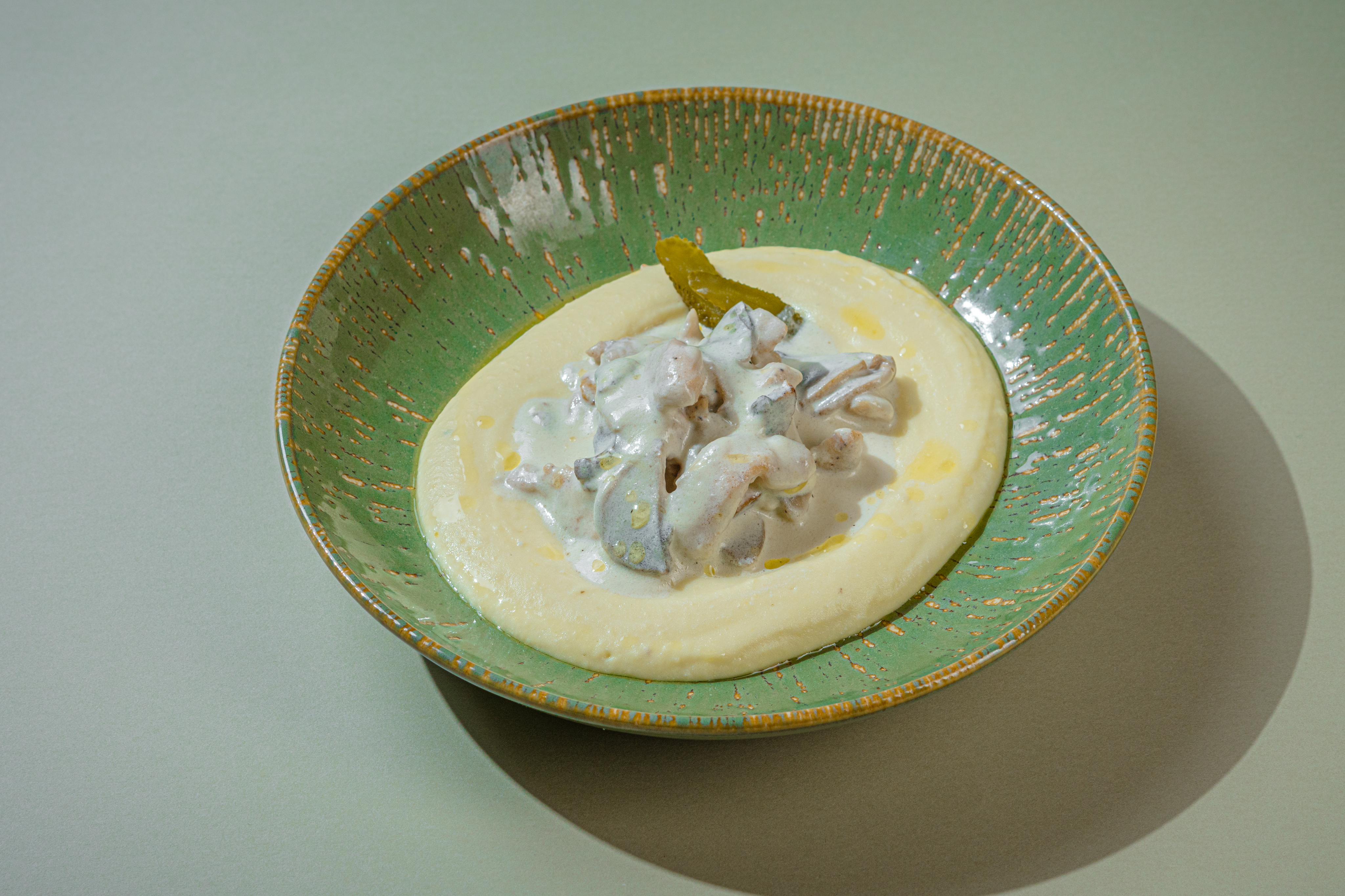 Куриный Бефстроганов — аппетитное горячее блюдо, которое порадует вас нежным вкусом: сочное филе грудки в сливочном соусе с шампиньонами, дополненное ароматной рукколой, сочными помидорами черри и пикантным лимонным фрешем, а картофельное пюре станет идеальным гарниром.