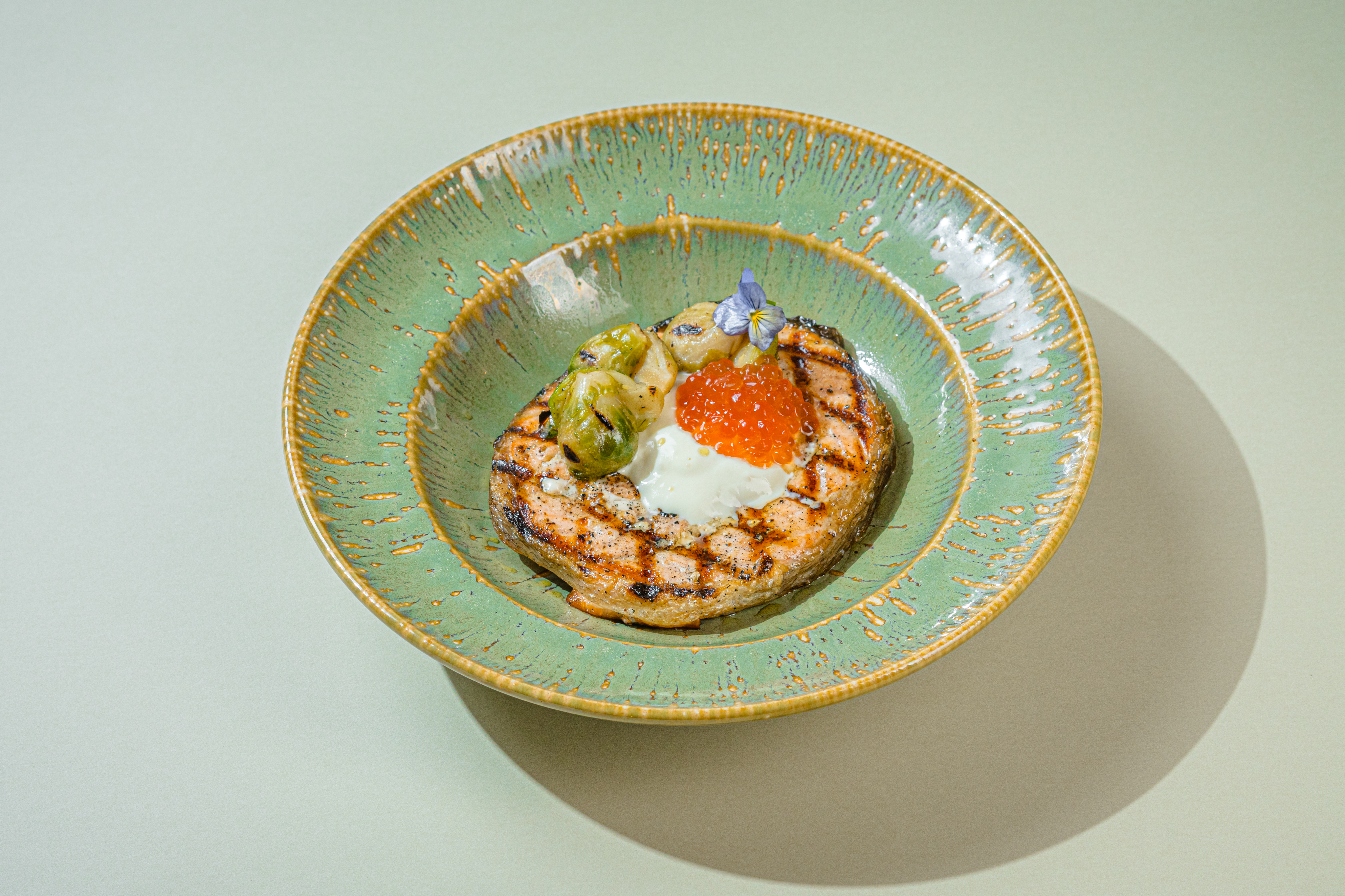 Сочная сёмга, приготовленная до идеальной степени прожарки, сочетается с нежными соцветиями брюссельской капусты. Лёгкая кислинка сублимированной малины и свежесть лимонного фреша оттеняют сливочный соус и аромат зелёного масла. Стейк из сёмги — гармоничное сочетание вкусов и текстур