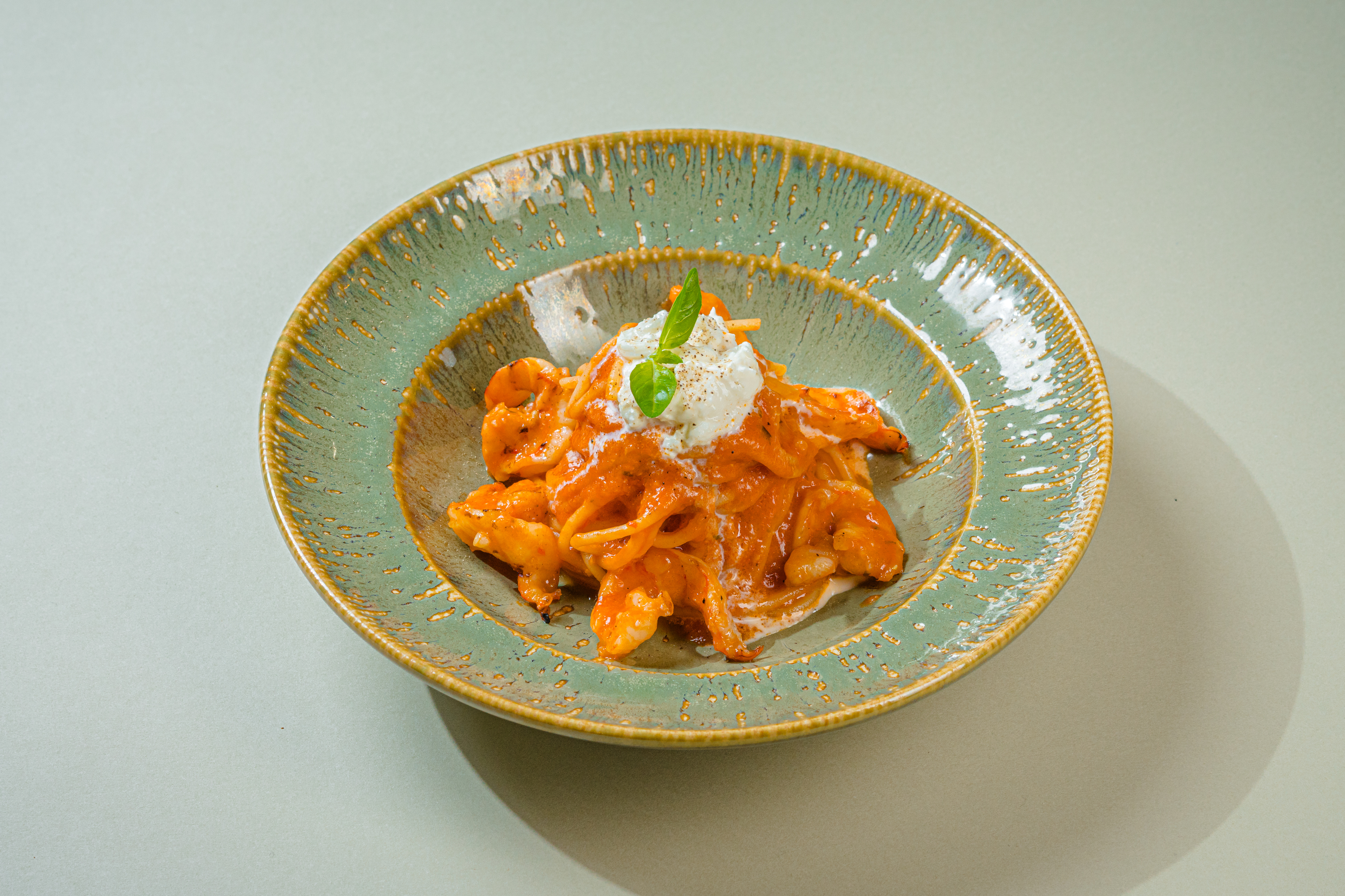 Горячее блюдо с пастой и насыщенным томатным соусом. В нём чувствуется лёгкая острота перца и нежность страчателлы, аромат базилика дополняет вкусовую палитру. Куриное филе и креветки делают блюдо сытным и интересным.