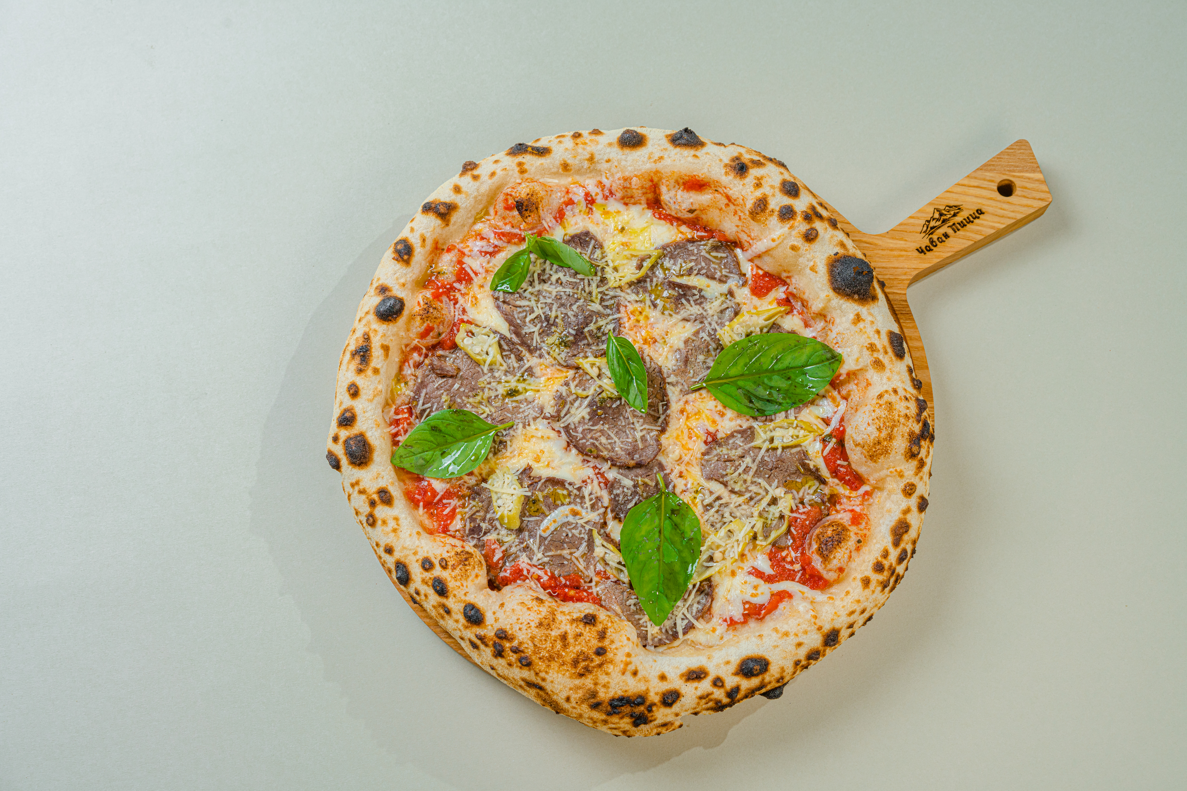 Пицца «Бон-Филе» (30 см) — аппетитная пицца с сочной говяжьей вырезкой, нежной бамией и ароматными травами. Томатный соус, зелёное масло и свежий базилик гармонично дополняют вкус, а сыр пармезан придаёт пикантность. Попробуйте и оцените богатство вкусов в каждой порции!