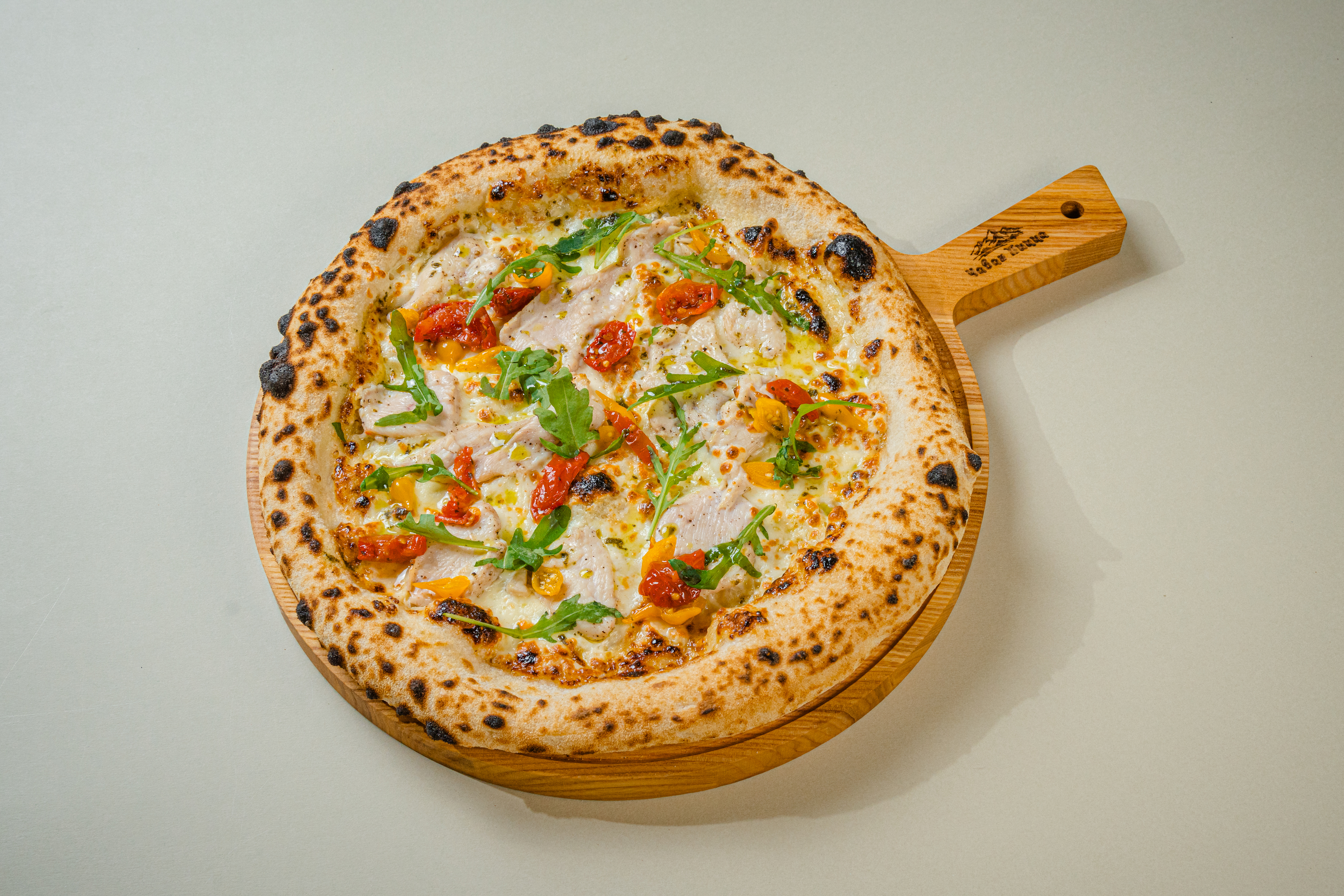 Пицца (30 см) с сочным куриным филе. Украшена руколой, маринованным перчиком и вяленными помидорами. Соус Цезарь придаёт блюду особый вкус