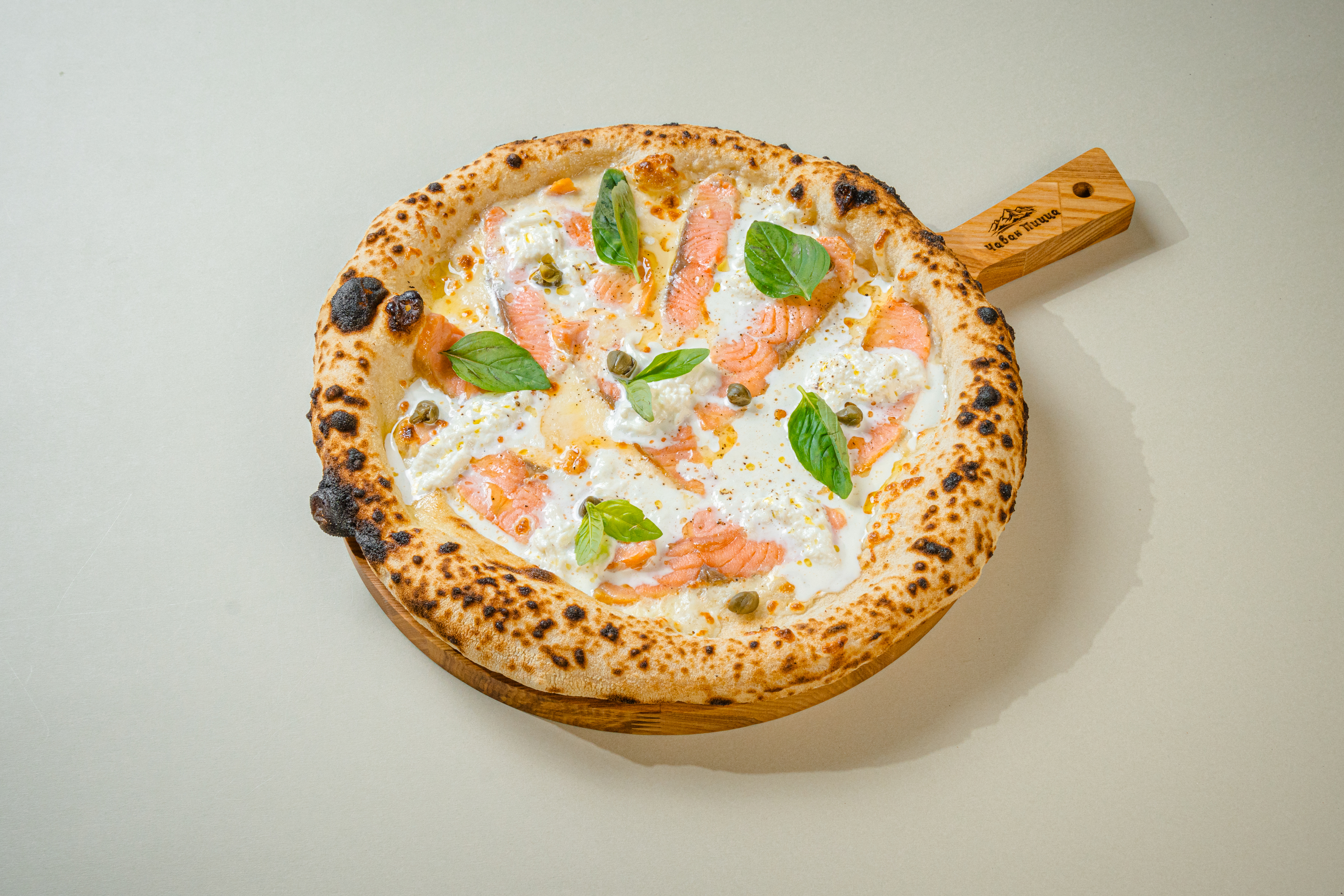 Пицца (30 см) с нежным запечённым лососем. Соус сливочный, сыр страчателла, каперсы, базилик и зелёное масло добавляют блюду изысканные нотки. Вкус сбалансированный, с лёгкой солоноватостью и ароматом свежих трав