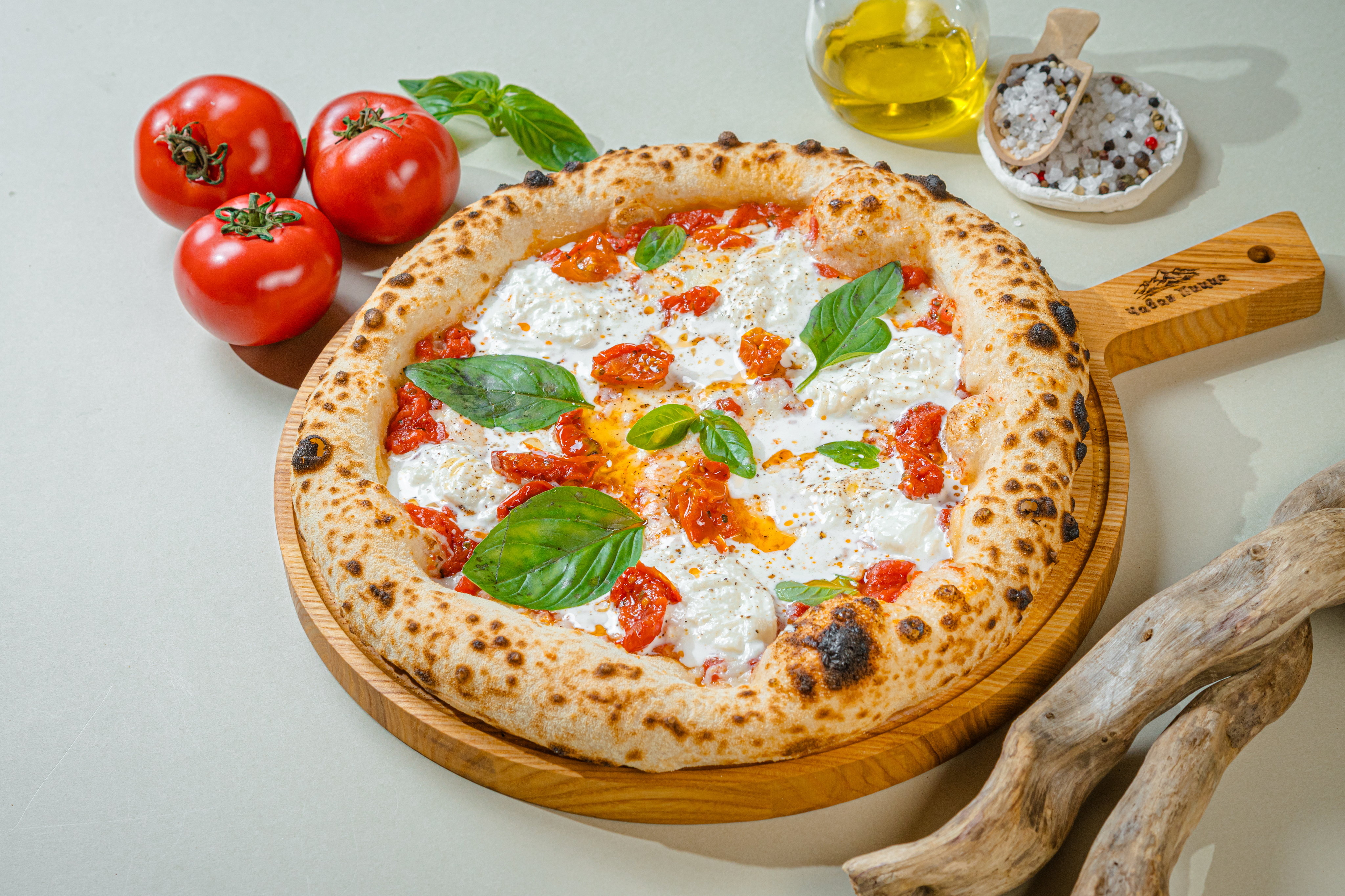 Мягкая основа покрыта томатным соусом. Сверху — слои моцареллы и страчателлы, вяленые помидоры, свежий базилик. Оливковое масло и чёрный молотый перец добавляют пикантности (30 см)