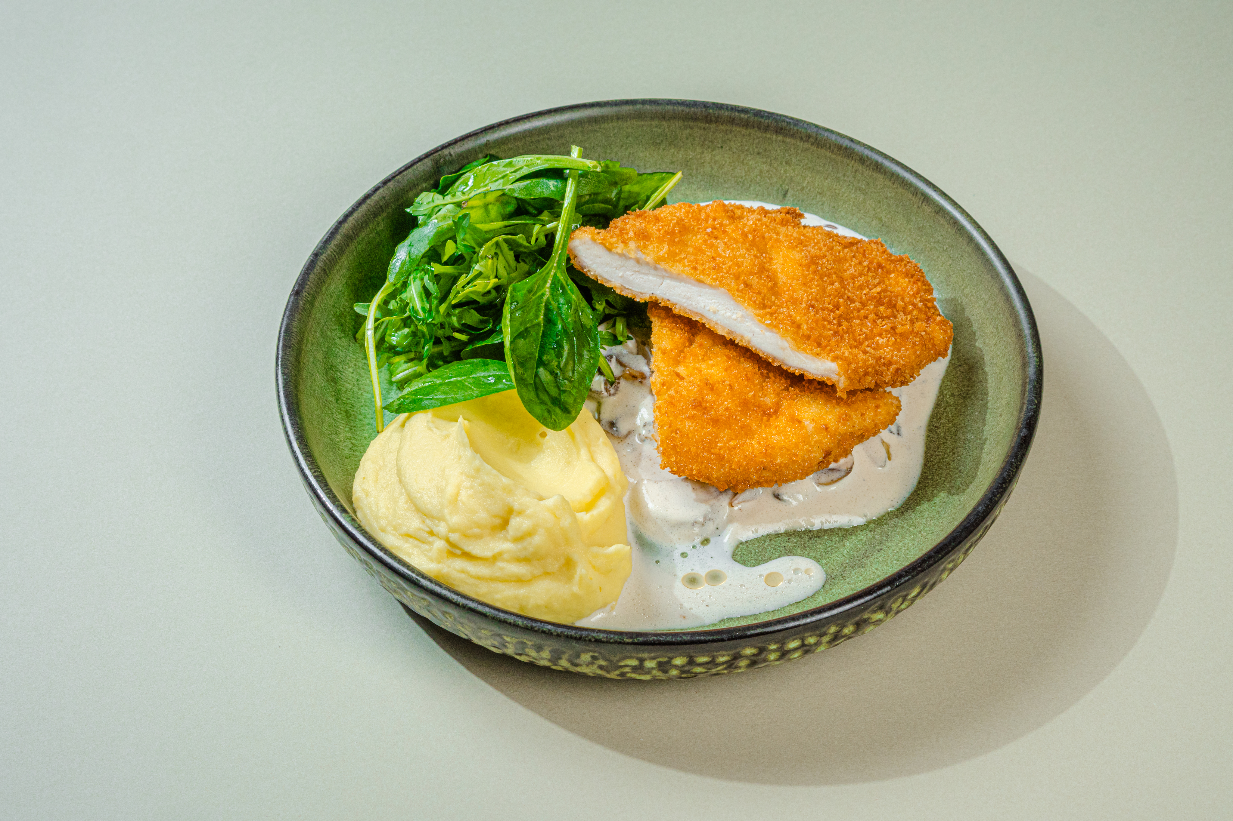 Горячие блюдо «Куриный шницель» — сочное и аппетитное угощение для ценителей вкусной еды! Нежное куриное филе, панированное в сухарях панко и обжаренное до золотистой корочки, подаётся с ароматным грибным соусом, воздушным картофельным пюре и свежей руколой, заправленной оливковым маслом. Попробуйте — и оцените гармонию вкусов
