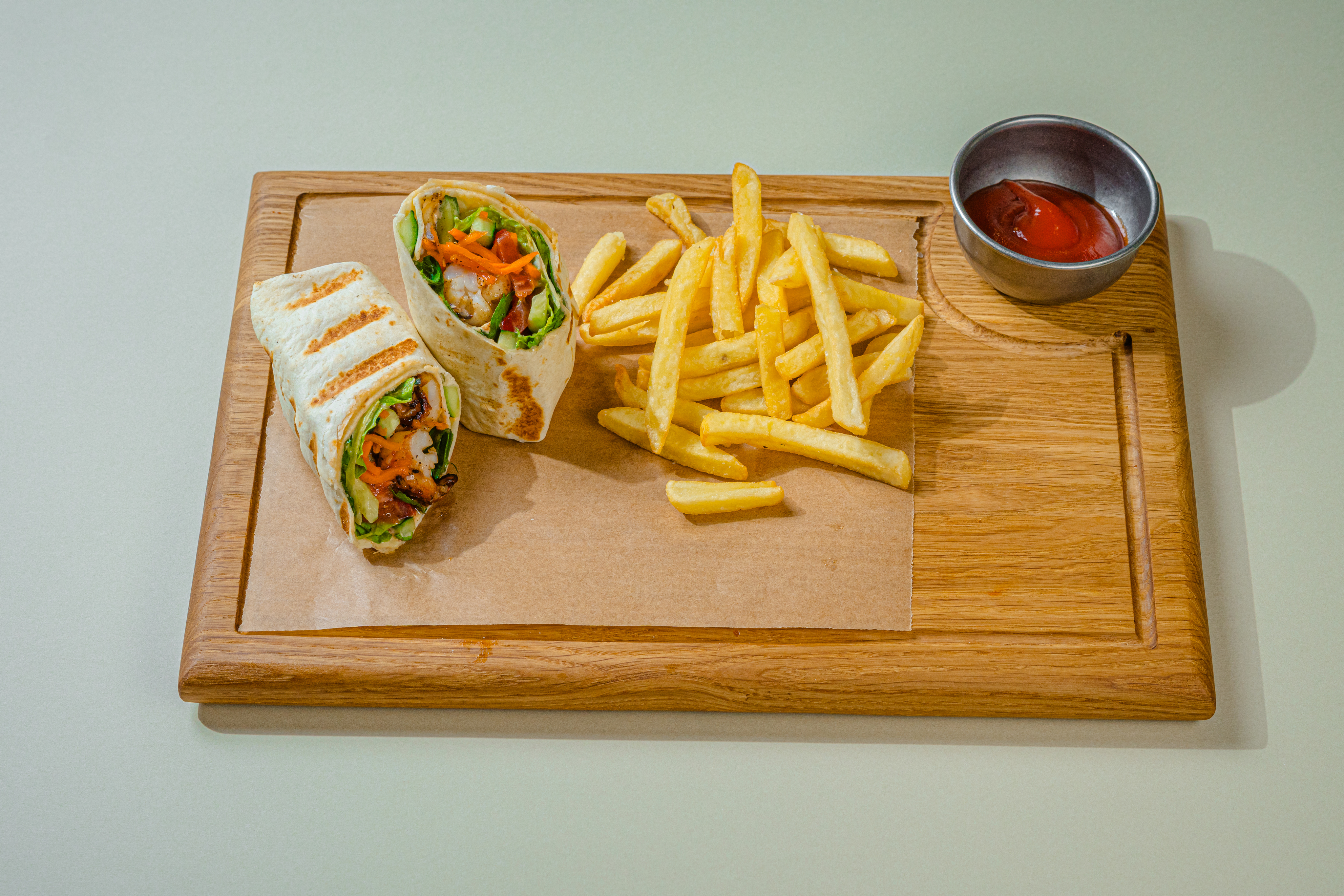 Погрузитесь в мир ярких вкусов с нашим вариантом шаурмы — хрустящие креветки в кляре и панировке, сочность узбекских помидоров и свежесть микс-салата из айсберга и романо в мягкой пшеничной тортилье. Кинза, морковь по-корейски, майонез, сырный соус и хрустящий фри добавят блюду неповторимые нотки и сделают каждый укус незабываемым. Попробуйте тортилья-ролл с креветкой — идеальное сочетание текстуры и вкуса