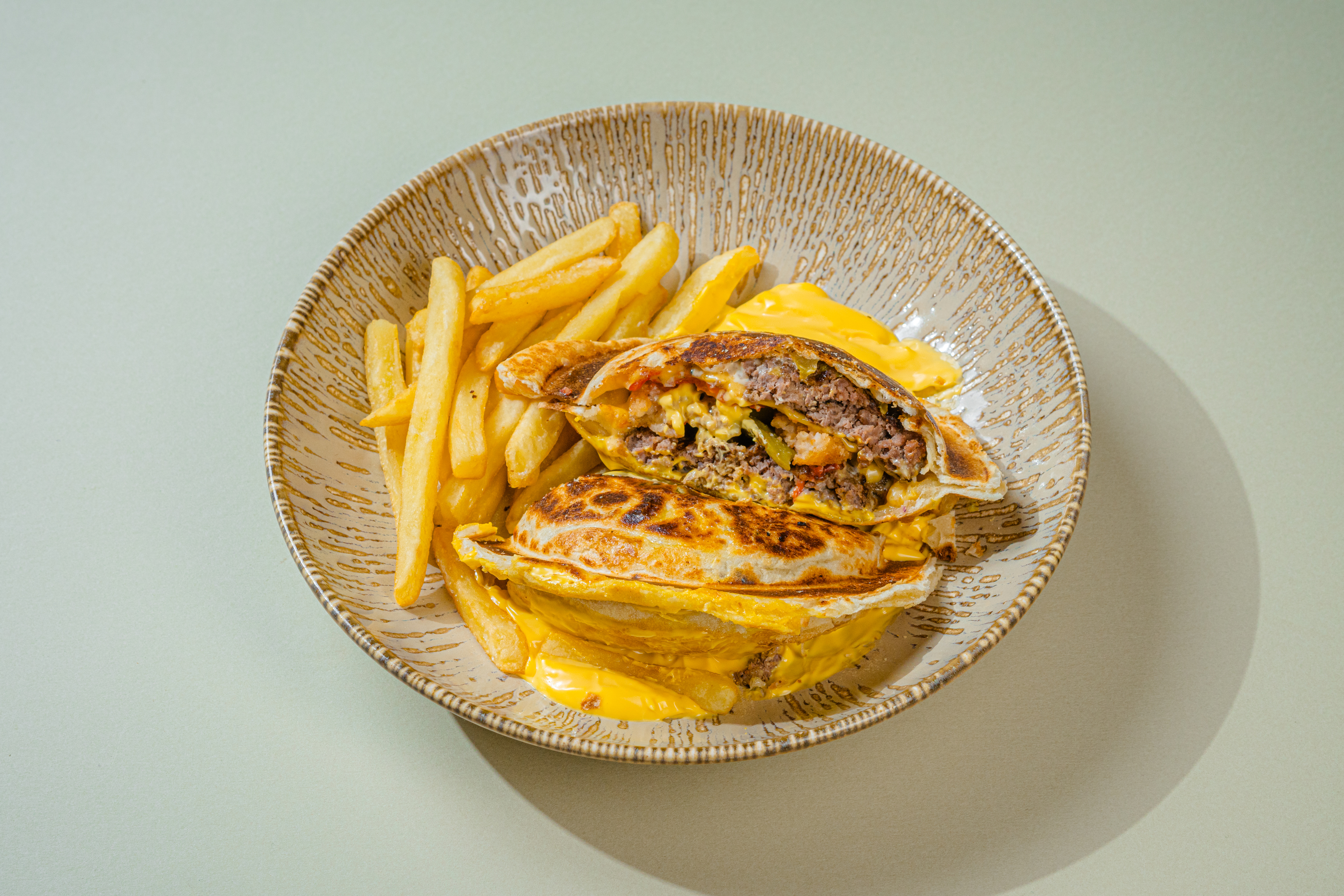 Бургер с сочной говядиной, свежими огурцами и помидором. Слоёное тесто придаёт хрустящую текстуру. Сырный соус гармонично дополняет вкус